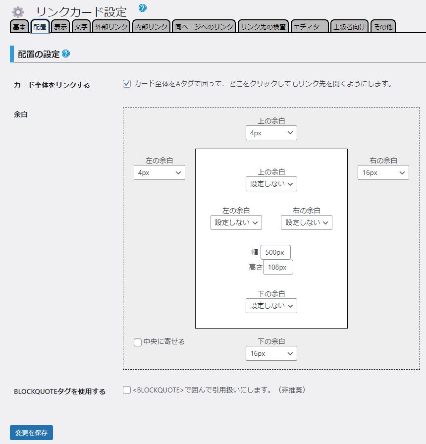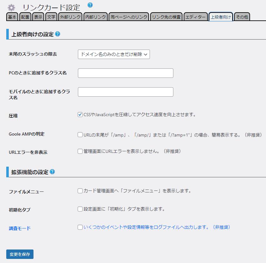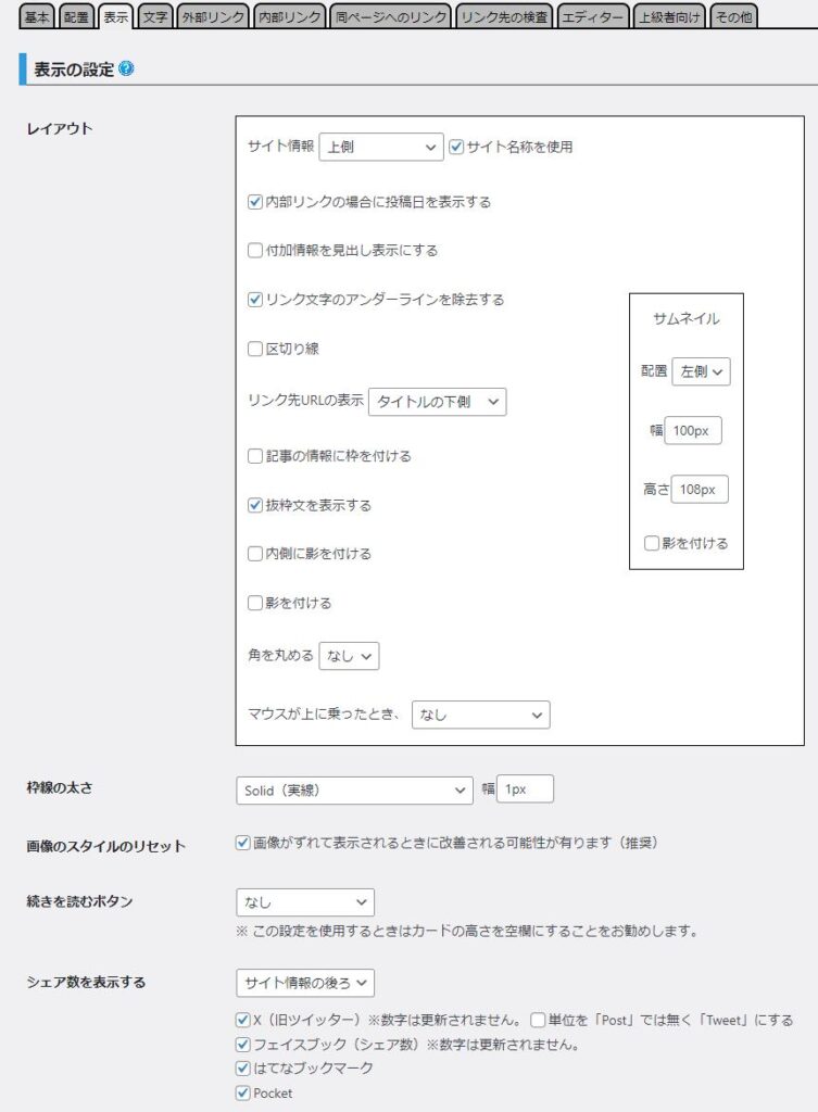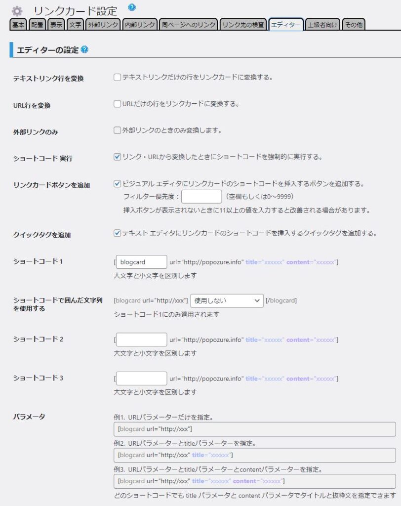 以下の設定を行うとショートコードを使わずに自動的にリンクカードが作成されるなんていうこともできます。便利ですが、意図しないところにブログカードが作成されても困るので本サイトでは利用していませんけど。