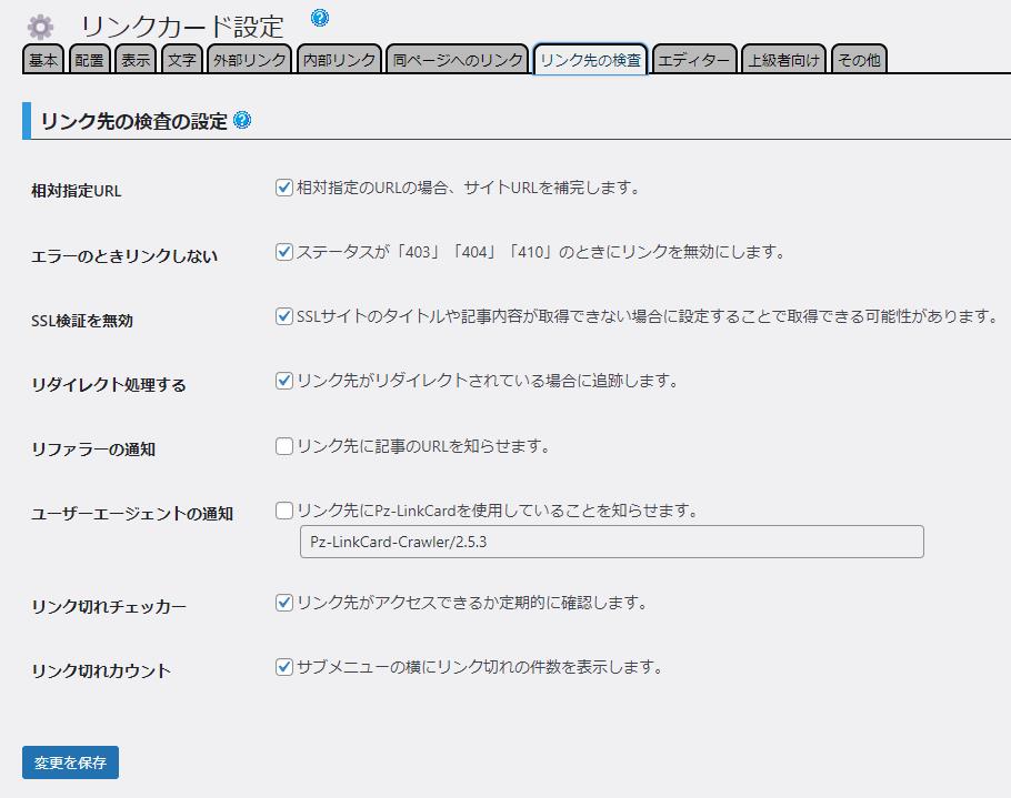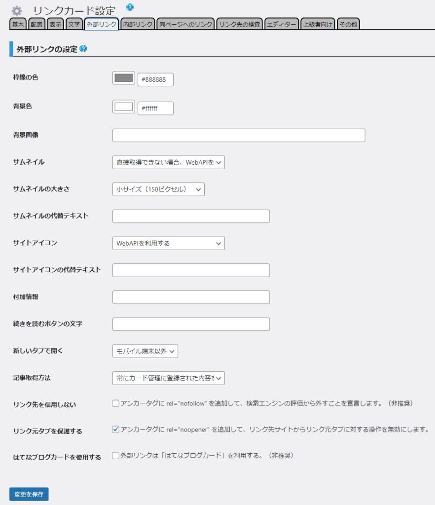 外部リンク設定でチェックしておきたいのが「リンク元タブを保護する:アンカータグに rel=”noopener” を追加して、リンク先サイトからリンク元タブに対する操作を無効にします。」。