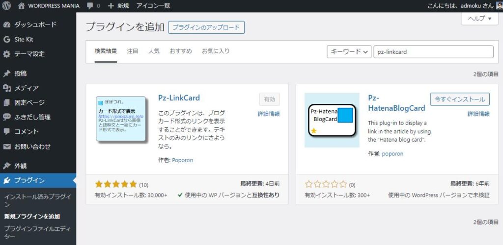 Pz-LinkCardはワードプレスの標準的なプラグインインストールで可能です。