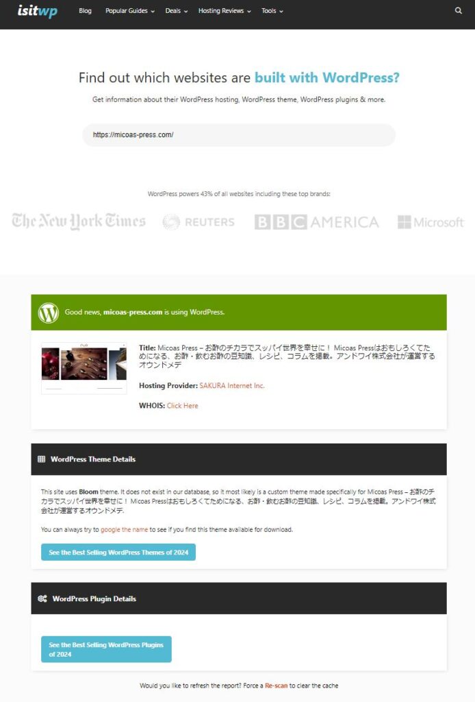 「isitwp」というウェブサイトを利用すればURLを入力するだけで、そのサイトが利用しているレンタルサーバー、WHOIS情報、ワードプレステーマ、ワードプレスプラグインの情報を丸裸にしてくれるというスグレモノです。