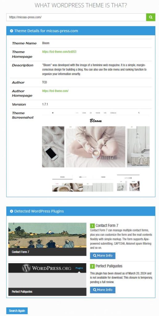 WTSは調べたいウェブサイトのURLを検索窓に入力して虫眼鏡アイコンをクリックするだけで、利用しているワードプレステーマとそのテーマの情報、Description、利用しているワードプレスプラグインまで表示してくれます。