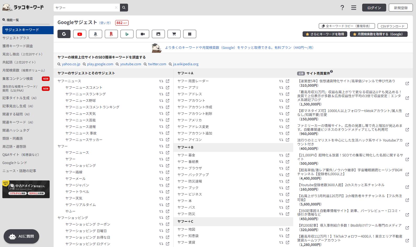 調査したいキーワードを入力することでGoogleをはじめとする検索エンジンや楽天などのECサイトに加え動画サイト等の多方面のサジェストキーワードを大量にピックアップすることができます。