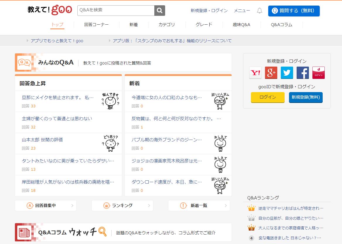 教えて!gooもYaho!知恵袋同様のQ&Aコミュニティの大手です。