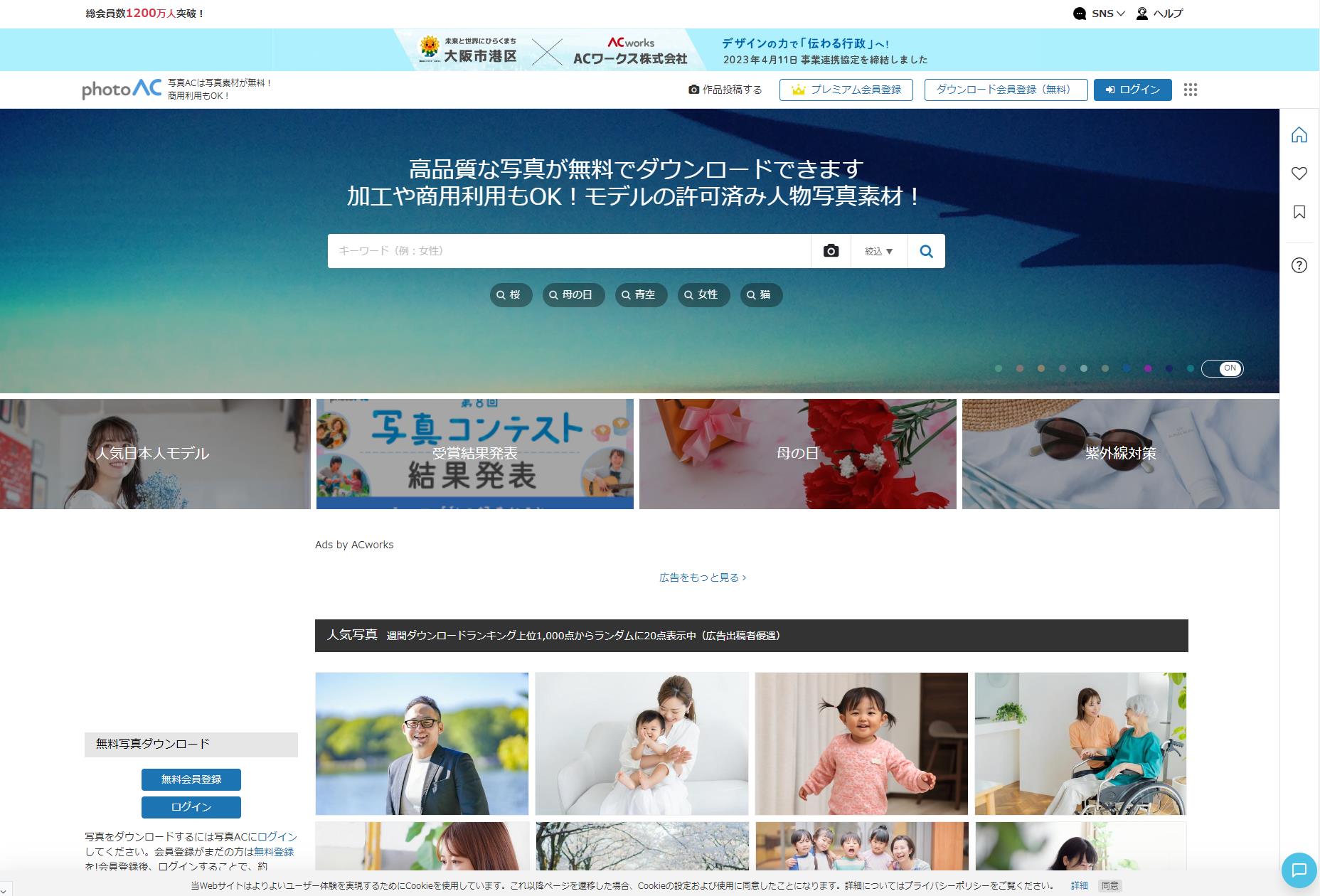 写真素材をダウンロードできる「写真AC」、イラストをダウンロードできる「イラストAC」、シルエット素材をダウンロードできる「シルエットAC」、アイコン・テクスチャー・パターン・テンプレート・パワーポイントなどのフリー素材をダウンロードできる「フリービーAC」等があります。