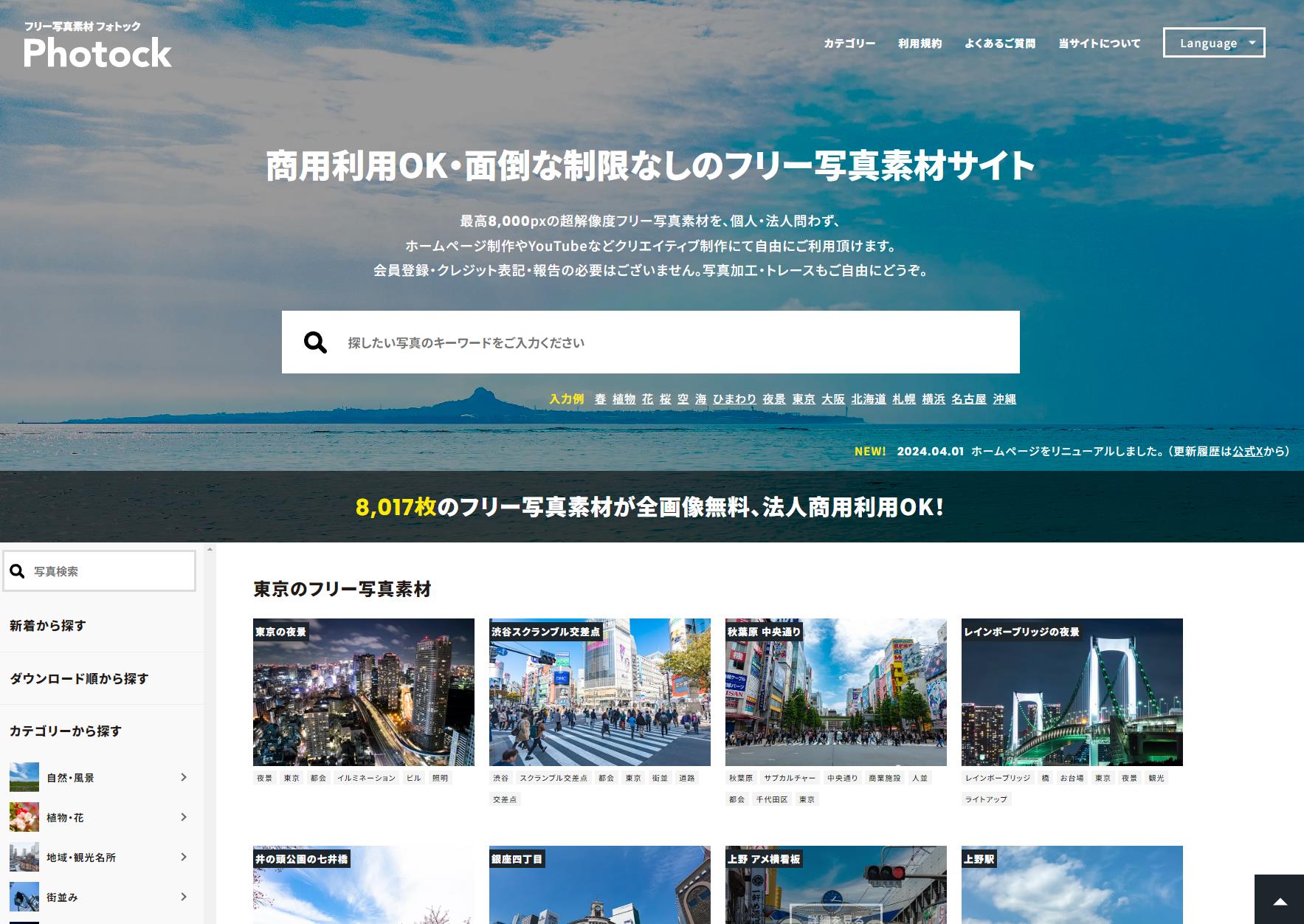 Photock(フォトック)は最高8000ピクセルの超高解像度フリー写真素材を個人法人問わず、ホームページ制作や動画制作に利用できるフリー素材サイト。