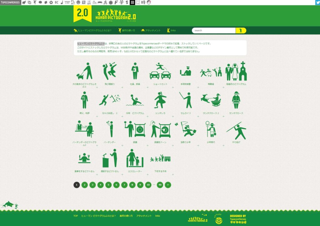 ヒューマンピクトグラム2.0は、非常口のあの人のピクトグラムをTopeconHeroesダーヤマの好みで拡張したフリー素材サイトです。