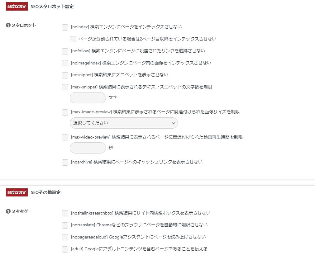 ロボット設定の「デフォルト設定を使用」をオフにすると、Robotsメタの詳細設定項目が表示されます。