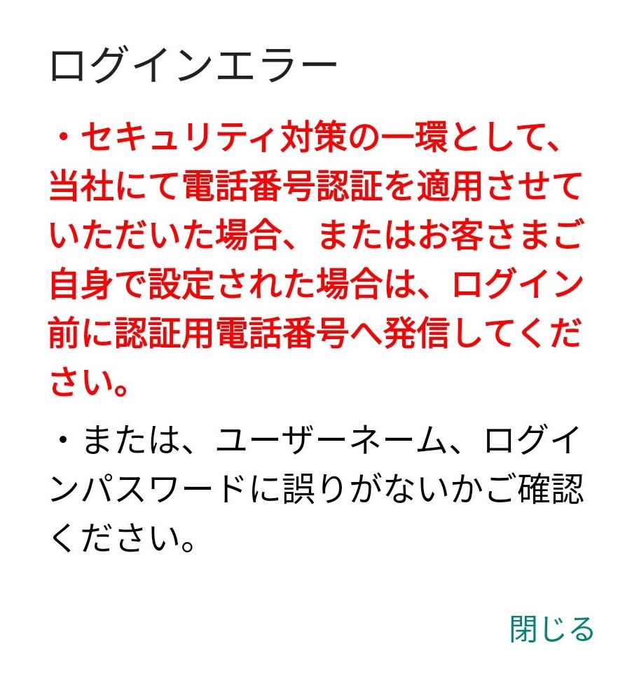 セキュリティ対策の一貫として、当社にて電話番号認証を適用させていただいた場合、またはお客さまご自身で設定された場合は、ログイン前に認証要電話番号へ発信してください。